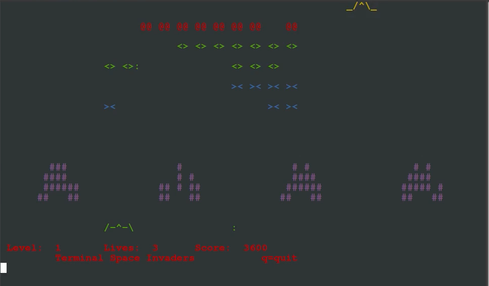 You need only the (space)-key to fire your laser gun and the left/right arrow keys [or a-key/d-key] to move out of the way of the alien missiles. The terminal window must be at least 80-chars wide x 30-lines. There are no command-line options, but difficulty increases with level.